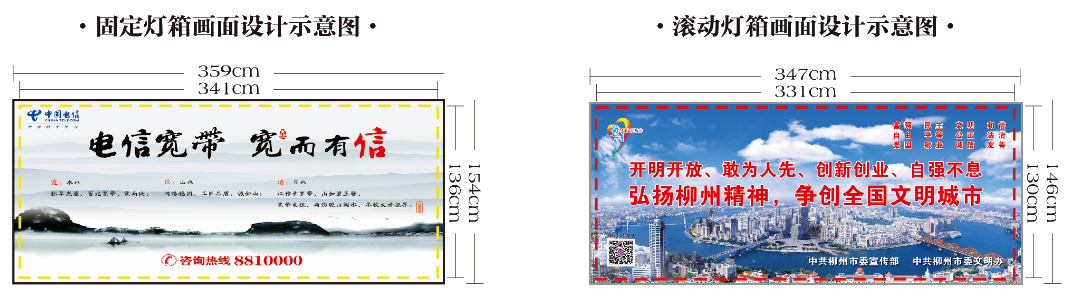 设计稿文字、图案必须设计在虚线内,固定灯箱四周各预留9cm,滚动灯箱四周各预留8cm,以保证内容信息不被遮挡。