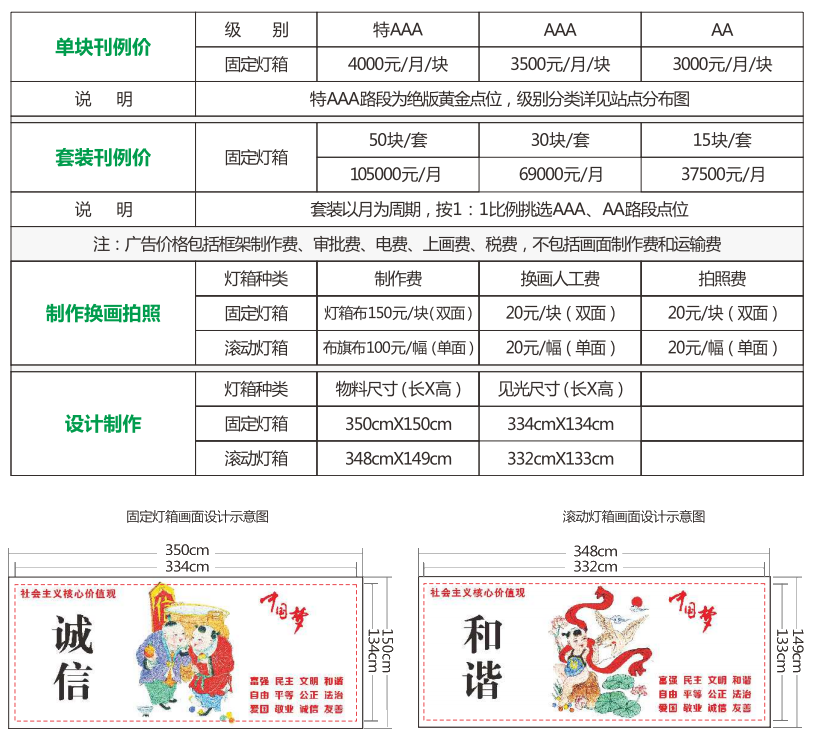 设计稿文字、图案必须设计在虚线内,固定灯箱四周各预留9cm,滚动灯箱四周各预留8cm,以保证内容信息不被遮挡。